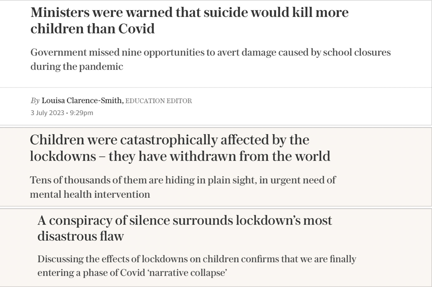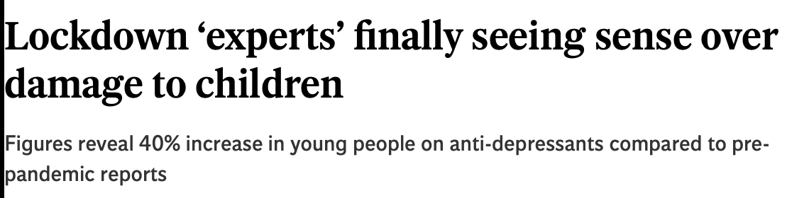 Lockdown effects were, perhaps, hardest on our children, who now suffer from permanent learning loss as well as excess mortality and booming anxiety disorders, as indicated by a raft of recent headlines, like these from the UK Telegraph: