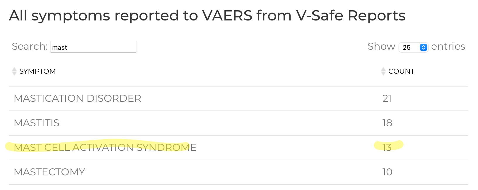 And even more. Out of 32,492 V-Safe reports in the U.S. VAERS database, there are at least 13 reports of MAST diagnosis following covid vaccination: