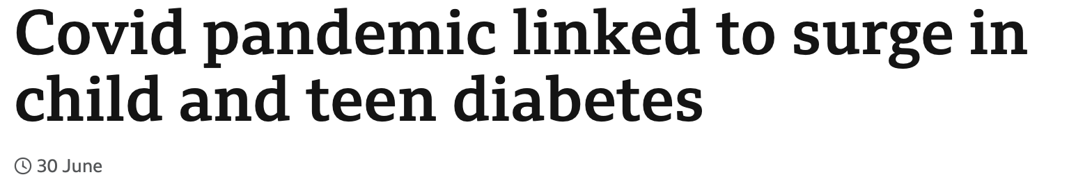 The BBC article reported an unlikely connection between childhood Type I diabetes and lockdowns: “Some scientists believe it is possible that lockdowns and physical distancing during Covid meant many children did not get sufficient exposure to germs and missed out on this additional protection [vs. type 1 diabetes].”
