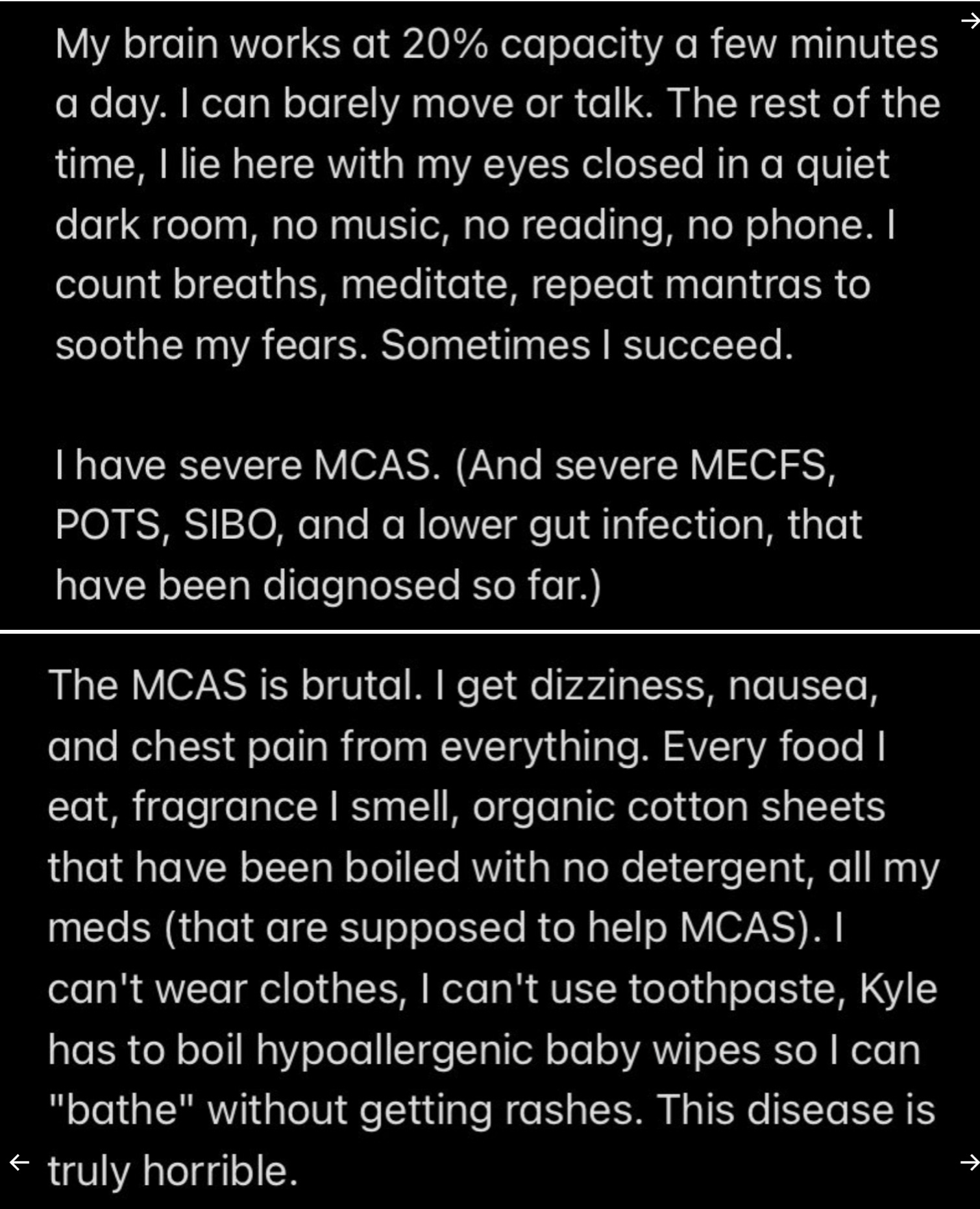 The evolving history of Dianna’s last few months of social media posts is a nightmarish catalogue of frightful, creeping deterioration. It started in December 2022 with chronic fatigue and headaches. Now she’s completely bedridden, all day long, every single day: