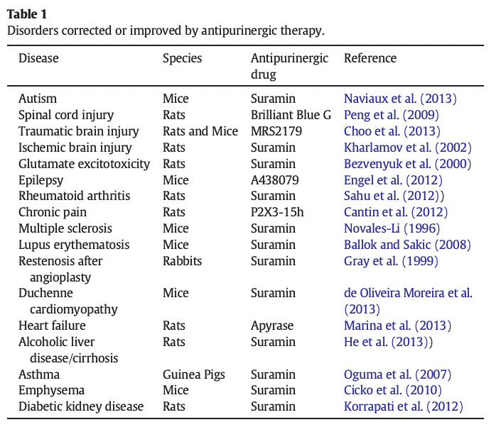 Presently, one drug, suramin (an antiparasitic medication for African sleeping sickness) exists that blocks all of the purinergic receptors throughout the body. In addition to suramin, other drugs that block specific purinergic receptors exist, many of which have been demonstrated to improve autoimmune disorders Nauviaux associates with the CDR: