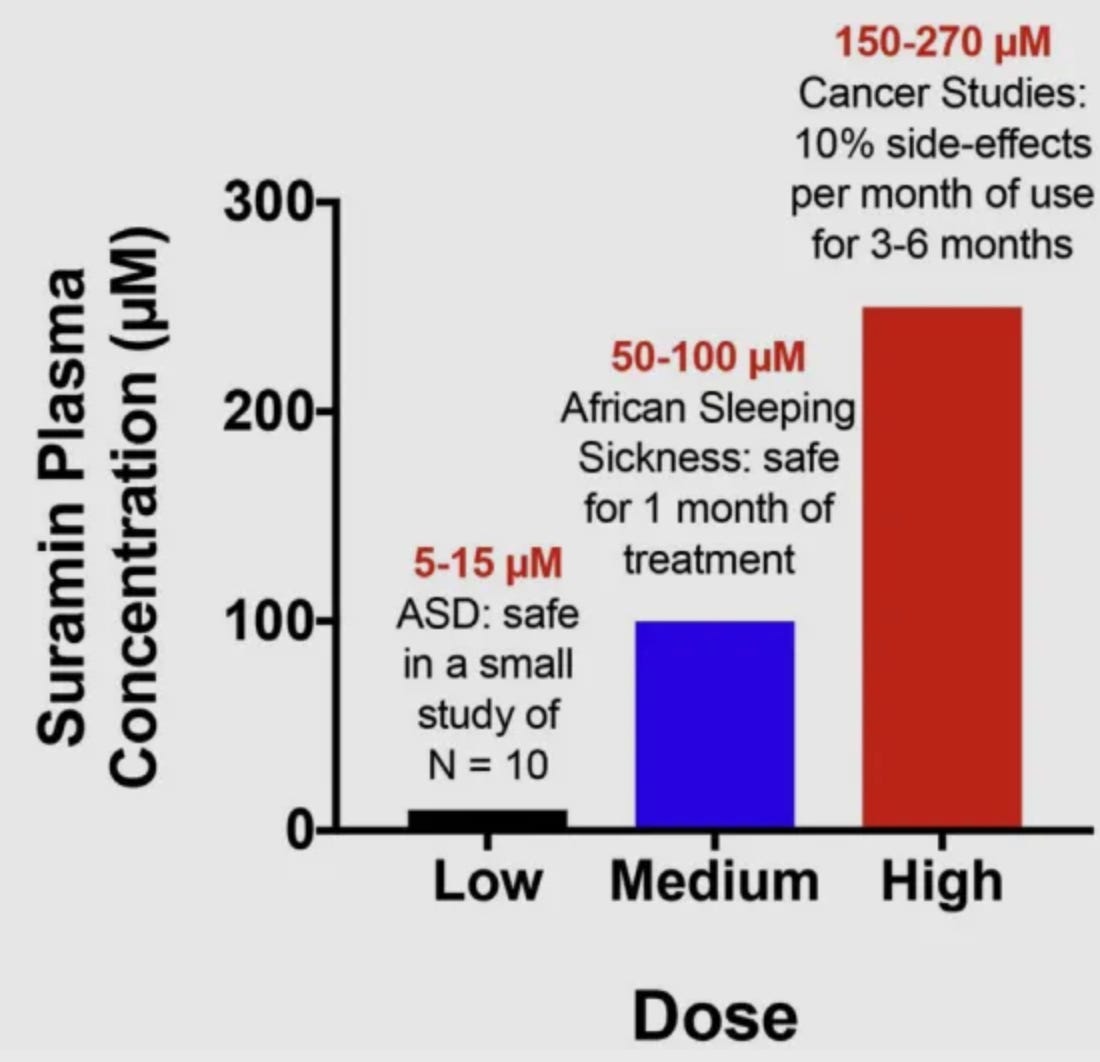 From doing this research, Naviaux determined low doses of suramin (5–15 μM) were sufficient to treat the CDR, suggesting this dose was relatively safe. For context:
