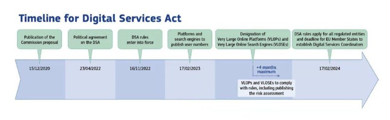 Not having done enough of what? Well, namely censorship: suppression of content that the European Commission deems to have been in some way or another harmful in the circumstances. Hence, the importance of the August 25 date. For August 25 will mark exactly four months since the European Commission officially designated 17 “Very Large Online Platforms” and two “Very Large Online Search Engines,” and from that date forward, per the below timeline, the designated entities will have to be in compliance with the EU’s Digital Services Act (DSA), which is designed precisely to “regulate” online speech.