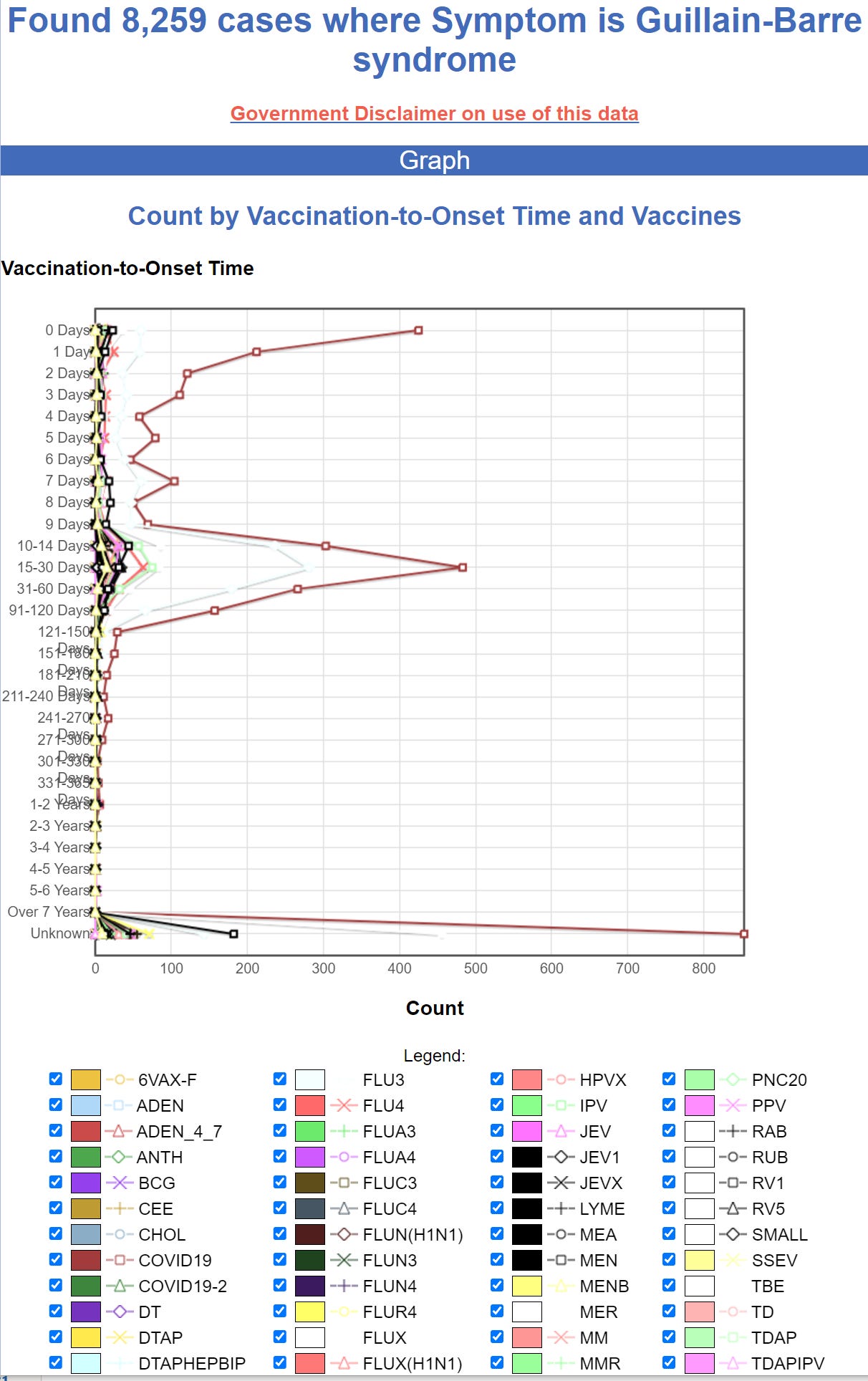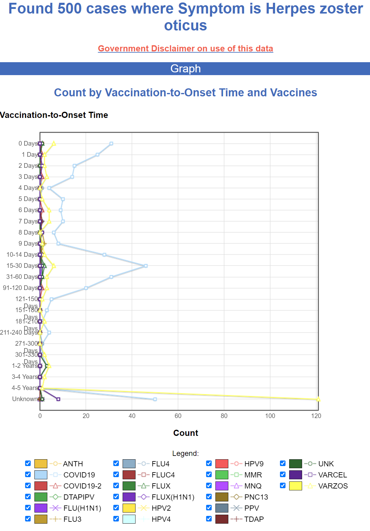 The query for myocarditis for all vaccines in VAERS looks like the graph below. Remember the shape. You’ll see this pattern again.