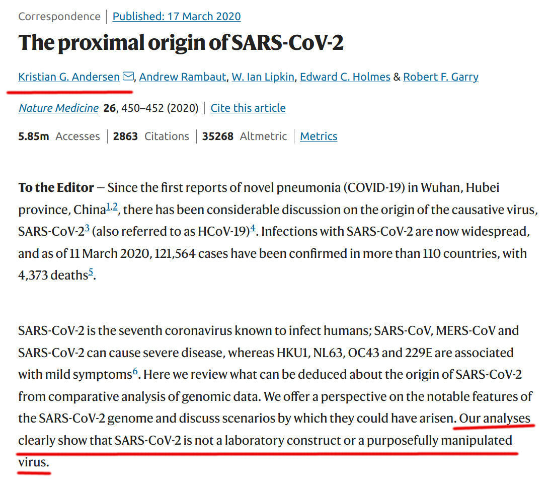 The scientific establishment insisted, with the appearance of absolute certainty, that Sars-Cov-2 came from nature. Their most important act was publishing the “Proximal Origins” paper in Nature Medicine, written by prominent virologists, that denied any possibility that Sars-Cov-2 was lab-designed.