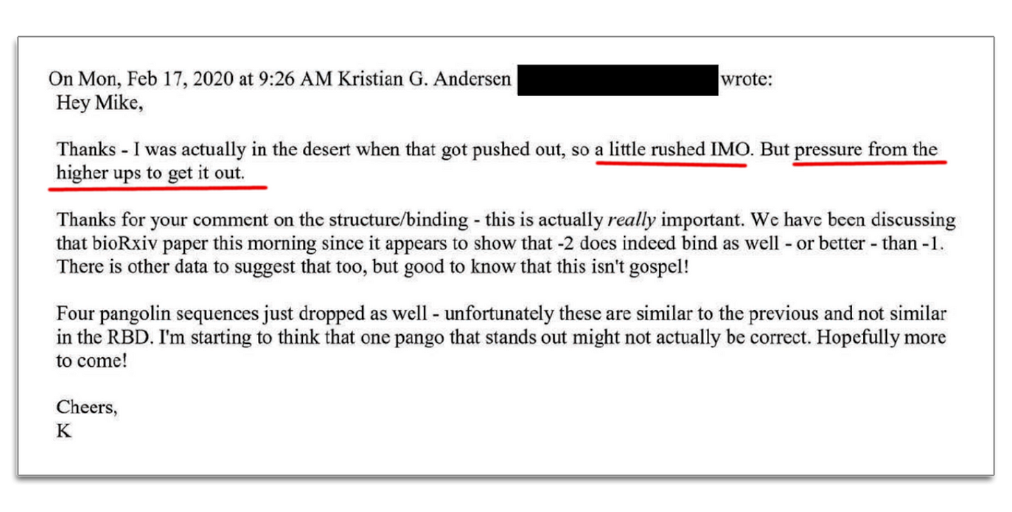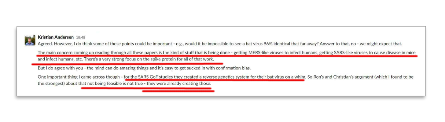 The authors acquired emails and chats from an invitation-only Slack channel. It turns out that Kristian Andersen, the main author of the Nature Medicine article denying the lab origin of Covid-19, privately believed that Sars-CoV-2 was lab engineered.