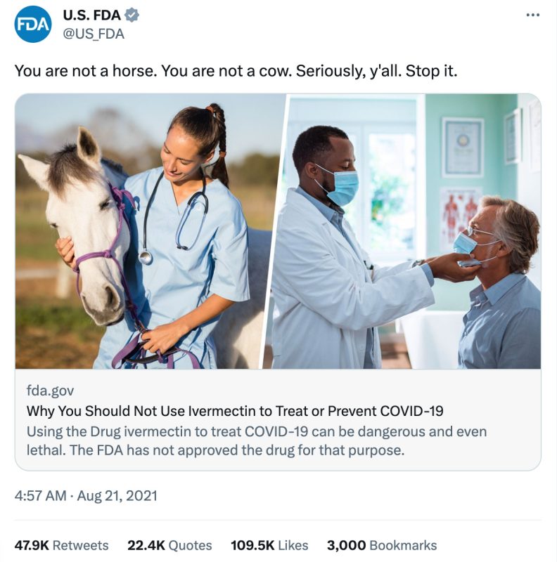 Seeing the success of ivermectin, and knowing that an effective off-the-shelf medicine would eliminate the market for a Covid vaccine, the US Food and Drug Administration ran a nationwide campaign to mock the drug and block people from getting it. This tweet alone likely resulted in the deaths of thousands of Americans: