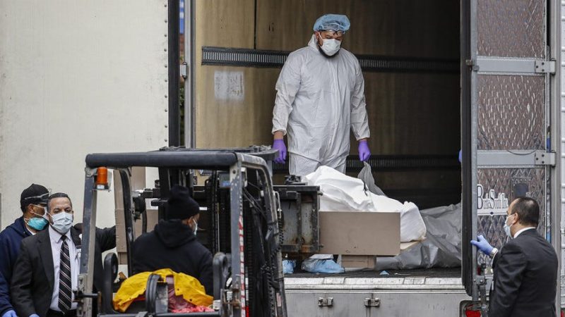 And if the refrigerated morgue trucks were not enough, as the New York Times, Washington Post, Time Magazine, USA Today and other mainstream publications all ran with overhead photographs of New York City’s potter’s field on Hart Island. Later analysis challenged the notion that there had been an increase in such burials, but by then the visual message of danger and doom was already firmly planted in the public imagination.