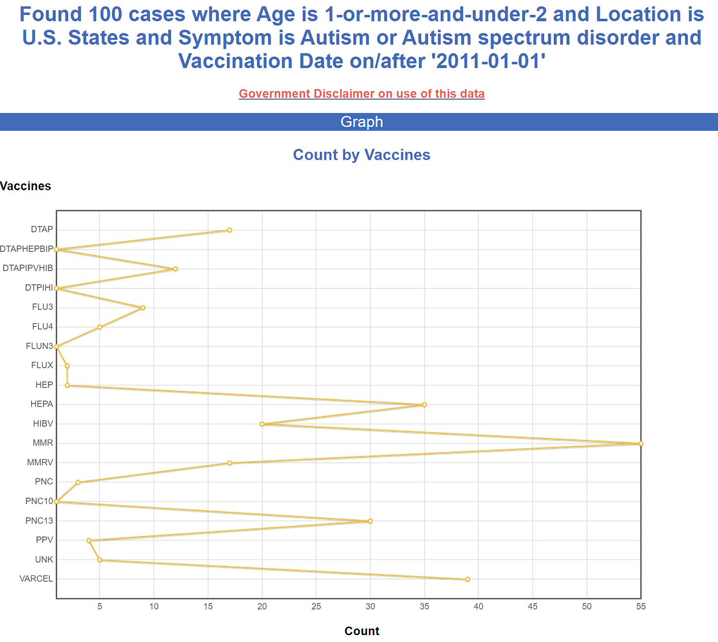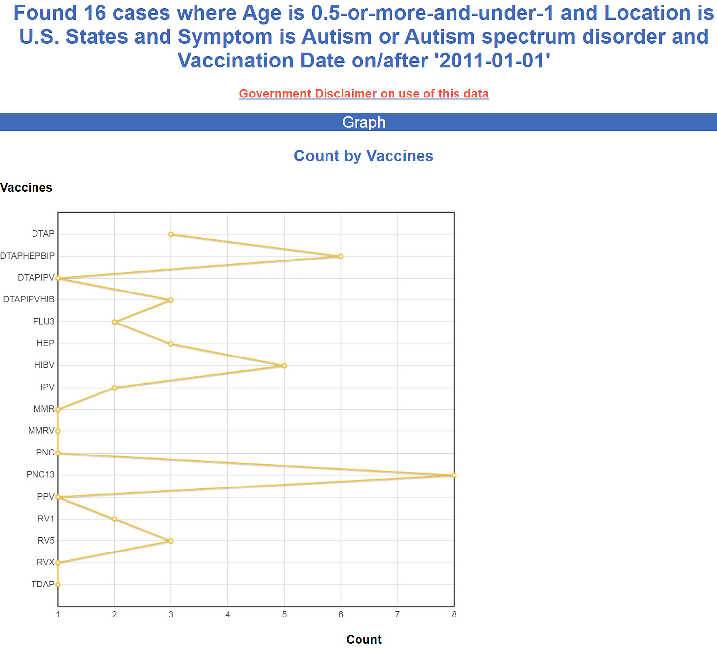Search for “autism or ASD” over all vaccines, all age, all time, all locations. This gives us a relative feel for which “monovalent” vaccines are the most likely to be the most problematic: