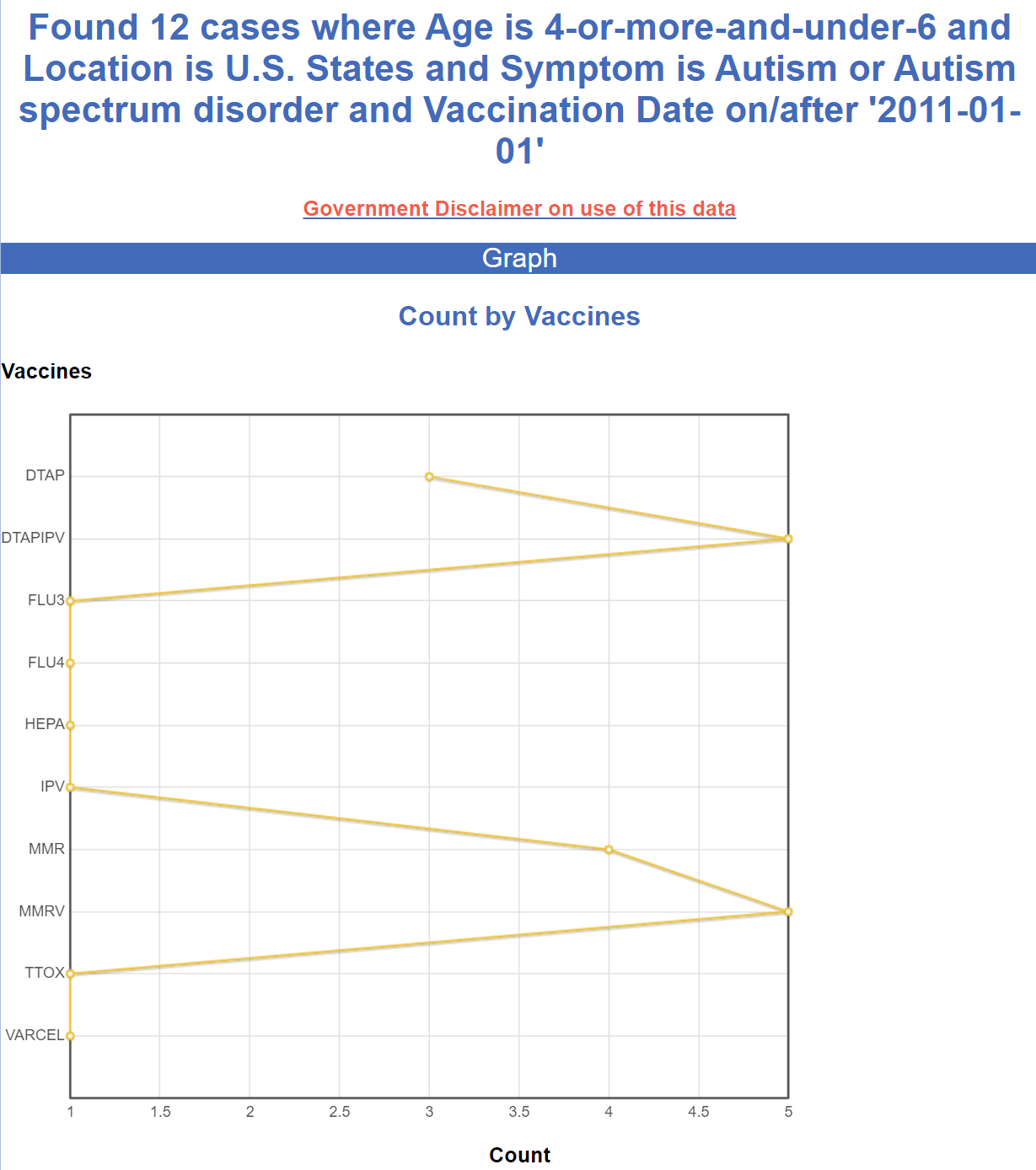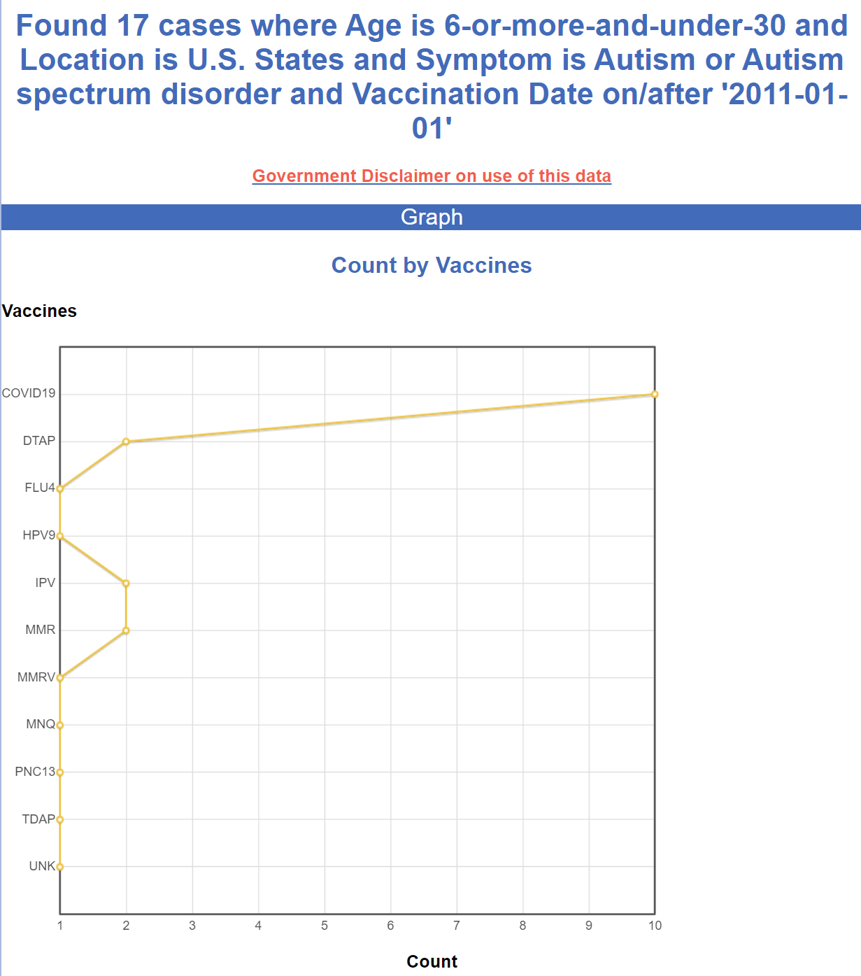 Below is a query for people from age 6 to 30 for the last 12 years combined. As you can see, the COVID vaccine is the clear winner, even though it just got on the market. FLU3 had zero cases. FLU4 had only one case of autism in the 12 year period for this age range.