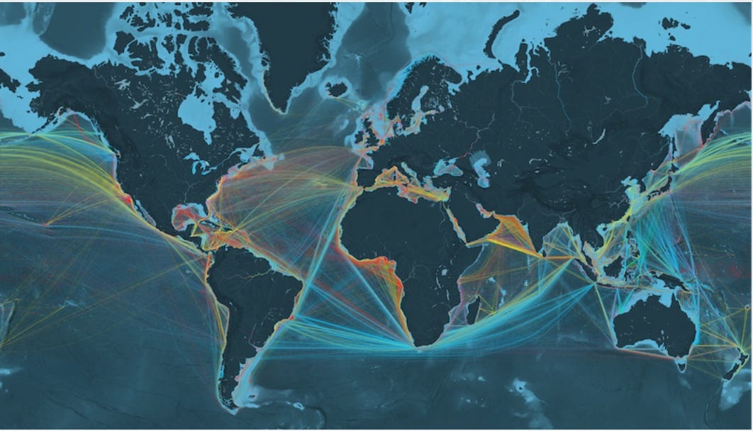 This amazing video illustrating typical shipping patterns. At the outset of the Great Recession, this type of tracking showed that all of this movement suddenly stopped- the sea lanes were empty.