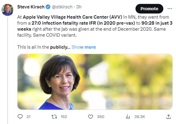 - Up to 2X higher likelihood of dying from COVID short term and an increased risk of catching COVID as well: Residents got a compromised immune system from the jab, so they got COVID and died from COVID in record numbers. For example, at Apple Valley Village Health Care Center (AVV) in MN, there were 90 COVID cases in the first 3 weeks of Jan 2021, and at least 28 people died as a result of those infections. Yet in all of 2020, there were just 27 COVID cases and not a single death from COVID. At AVV, they went from a 0:27 death:infection track record (pre-vax) to 28:90 in just 3 weeks right after the jab was given at the end of December 2020. Same facility. Same COVID variant. Why was the COVID infection-fatality rate (IFR) so drastically different with the same variant, the same facility, and the same resident population? I wanted to know the answer to that but everyone at AVV refused to return any of my calls. But we see this in other places. The only thing that makes any sense is that it was the vaccine because it checks all the boxes. No other hypothesis has been offered. The good news is the doubling of the COVID IFR appears to be temporary as the IFR was only 20% higher in the months after the shots were given.