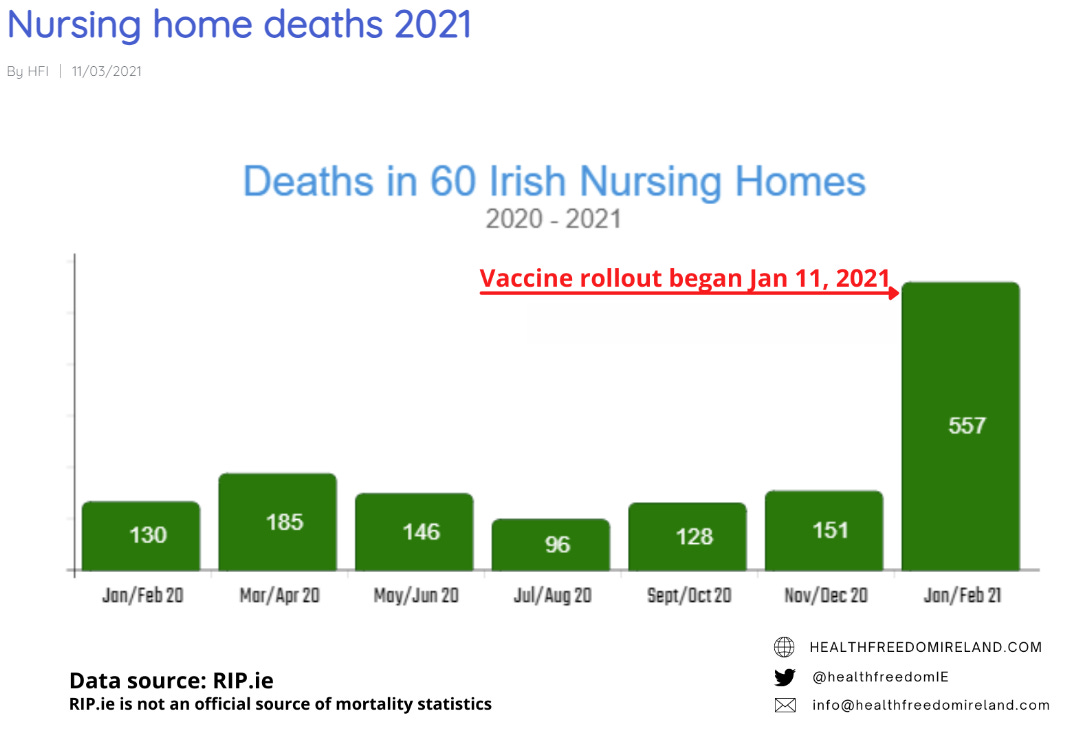 In addition, an analysis of elderly facilities in Ireland was fully consistent with what my analysis found: death rates in nursing homes skyrocketed right after the vaccines rolled out.