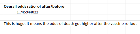 I simply compute the dead:alive for the period after the vax (Feb 2021 to May 2021) and divide it by the dead:alive for the period before the vax (Jun 2020 to the end of Jan 2021). I combined all the numbers from all 15,000 nursing homes with no omissions.