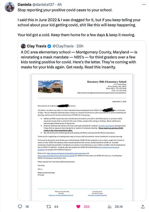 I saw this post today. A school in MoCo, MD (DC beltway) has reimplemented n95 masking for kids. As a side note: there is no n95 mask for kids— as these masks have not been validated in children. In response, one commenter suggests the only solution is to no long report COVID cases to school. Is this a sensible strategy?