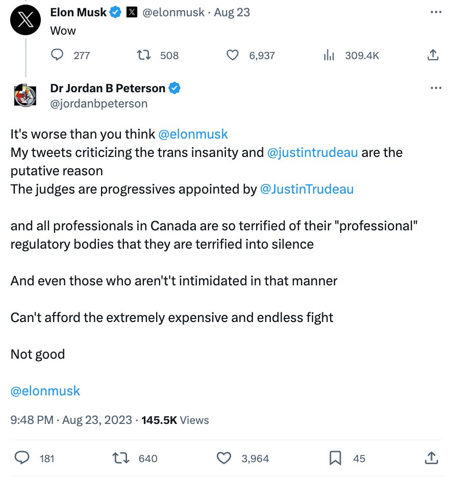 The Ontario Divisional Court dismissed Dr. Peterson’s claim in late August and upheld the College of Psychologists’ demand. The Court’s ruling admits its concern is “language used by Dr. Peterson in public statements” made in 2022. The nature of these statements?