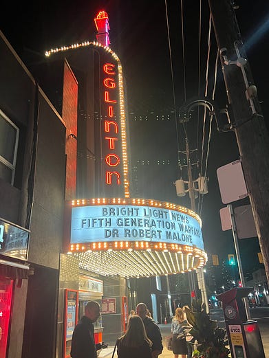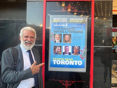 Today I returned from lecturing on Fifth Generation Warfare in Toronto, Canada. This was my second invited lecture to a group of “resistance” members, the first being almost exactly one year ago. Excellent talks were also provided by Drs. Jill Glasspool-Malone, Mark Trozzi, and Byram Bridle. At the theater I had the opportunity to meet with many old friends and newly found ones, including both Tammy Peterson (Mrs. Jordan Peterson) and various anonymous physicians who I have been in contact with since the very beginning of my journey objecting to the mismanagement and rampant ethical breaches associated with the COVIDcrisis.