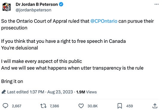 Peterson responded to the ruling by saying, “Bring it on” in a social media post, telling his fellow citizens, “If you think you have a right to free speech in Canada, you’re delusional.”