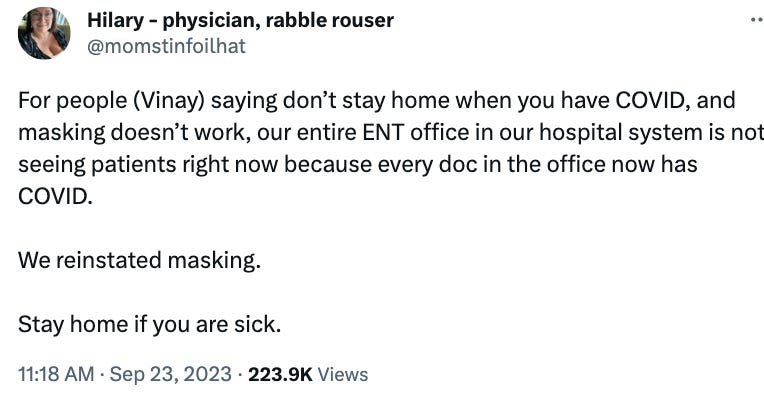 Consider one argument I saw online. An ENT doctor complaining that her practice is closing b/c all the doctors have covid, and masking is needed. Shall we list the errors?