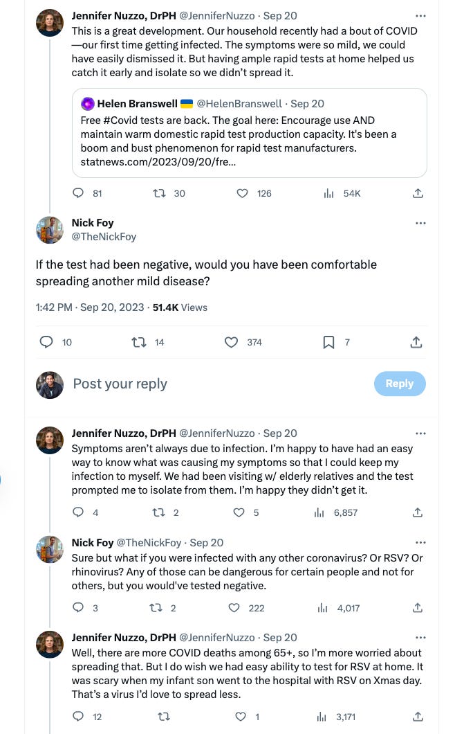 If someone disagrees with my strategy, ask them to prove their strategy is superior. The test manufacturers have been re-infused with hundreds of millions of dollars (from the Biden admin). Run a randomized trial showing testing (however you like) improves clinical outcomes. Until then, no one should test. It’s been 3 years of hysteria— a singular focus on one virus— ultimately you have to generate data if you want to push for continued interventions. Testing, and altering behavior, is an intervention.