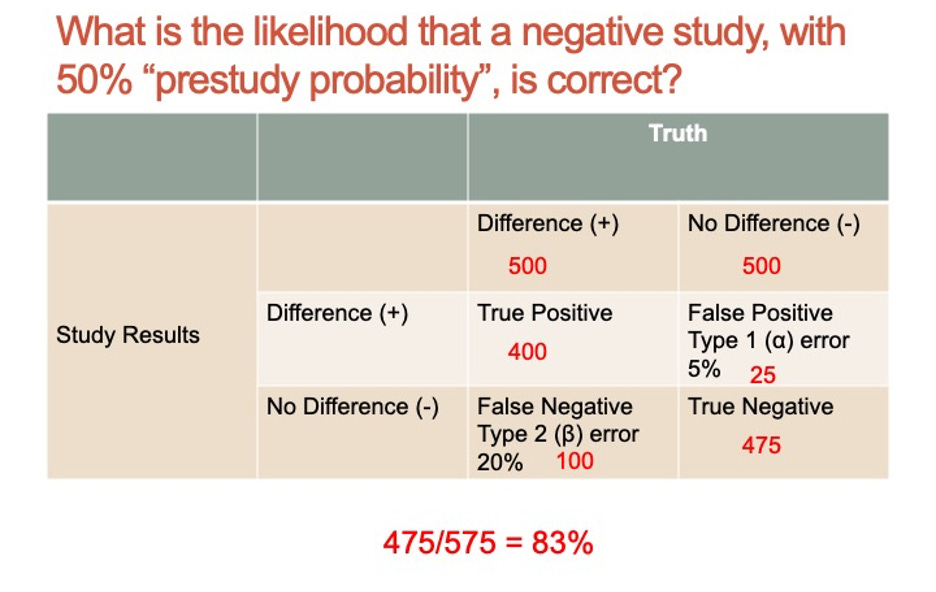 This next table is the important one. Here we have populated the table with numbers. Think of this as showing the results of 1000 studies. The likelihood, “prestudy probability,” of the treatment being effective, in this example is 50%, thus there are 500 in each column. Given that you know the alpha and beta error. The beauty of this is that knowing your pre-study probability and your alpha and beta error, you can fill in all the 2X2 table. You see that if your study is negative, there is an 83% chance that that is a true negative and a 17% chance that it is a false negative.[iv]