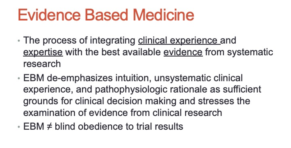 EBM is much misunderstood and, these days, often maligned, equating it to slavish devotion to the latest RCT in a high impact factor journal. What EBM really is a three-legged stool supporting your practice. It is the process of integrating clinical experience and expertise with the best available evidence from systematic research. I can’t even count the number of talks I given in which this slide appears.