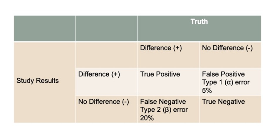 This table shows where alpha and beta error fit in. The columns represent truth, does a difference really exist between the intervention and the placebo. The rows are what we discover in our study. Thus, we may have a true positive study, one that finds a difference when one exists or all of the other possibilities.