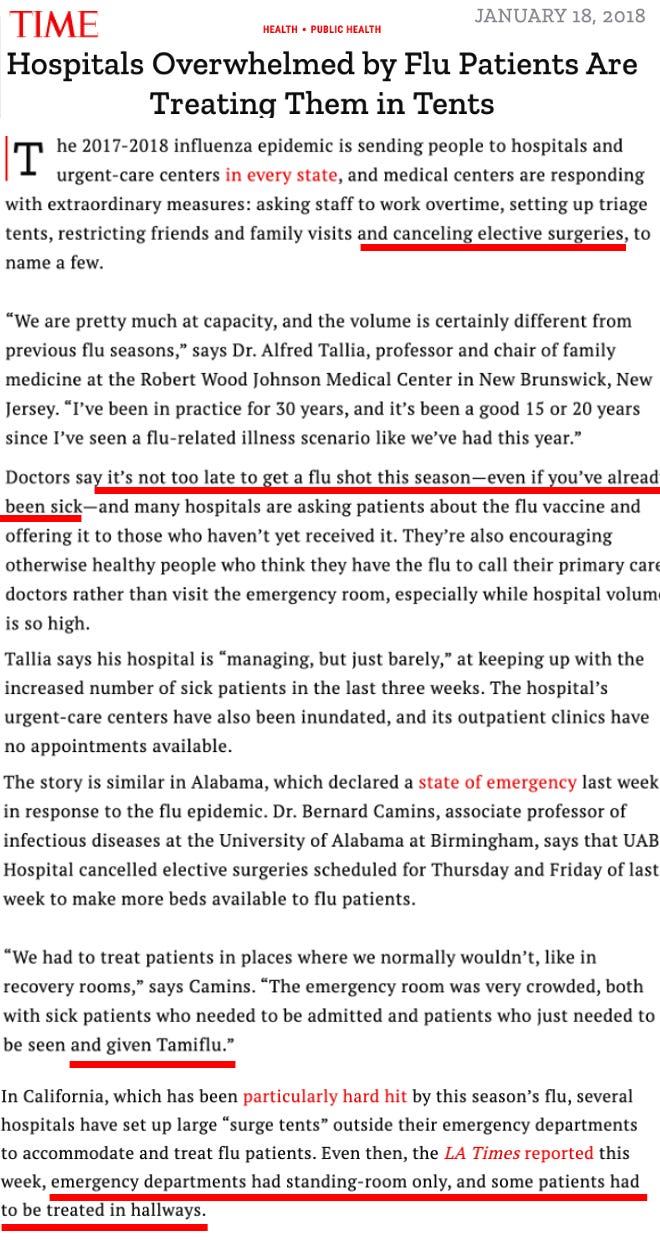 Note: after I published this article, I sought out Pierre Kory’s perspective on all of this. Like me, it’s been quite rare for him to see patients who were hospitalized primarily for the flu; instead the majority of them had an existing chronic illness that were hospitalized for that may have been exacerbated by the flu. However, he also emphasized an important point people do not appreciate on the flu vs. COVID debate. Because COVID has an aerosol transmission (which means it spreads rapidly from person to person) rather than a droplet spread (which entails it spreading much more slowly and makes it much easier to reduce the transmission of) this resulted in a large number of people catching it very quickly.