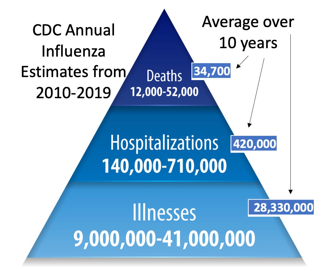 Before I go further, I want to note that these numbers are estimates, and that the CDC admits when they calculate the annual impact of the flu, many of the deaths never had a positive influenza test before they died nor was influenza listed on the death certificate. Instead, the CDC tries to account for the numerous flu cases they believe were there but no one recognized (e.g., you got the flu and then had a heart attack a month later). A short explanation of their methodology can be found here, and a longer one here.