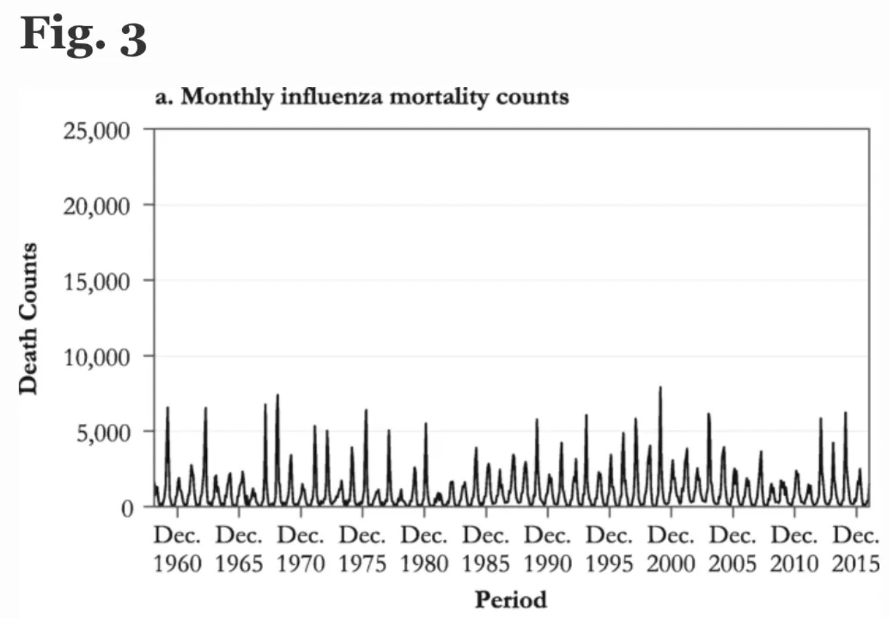 At this point, over half of the American population receives an annual flu shot, yet despite its clear failure to do anything (as the above graph shows—at best mass influenza vaccination has mitigated the effect of an aging population), the mantra is always the same. Not enough people are vaccinating and the most important thing you can do each year is to get vaccinated. [I think this graph is probably one of the most important in the paper – essentially zero change in outcome after a 1600% increase in given doses- mrossol]