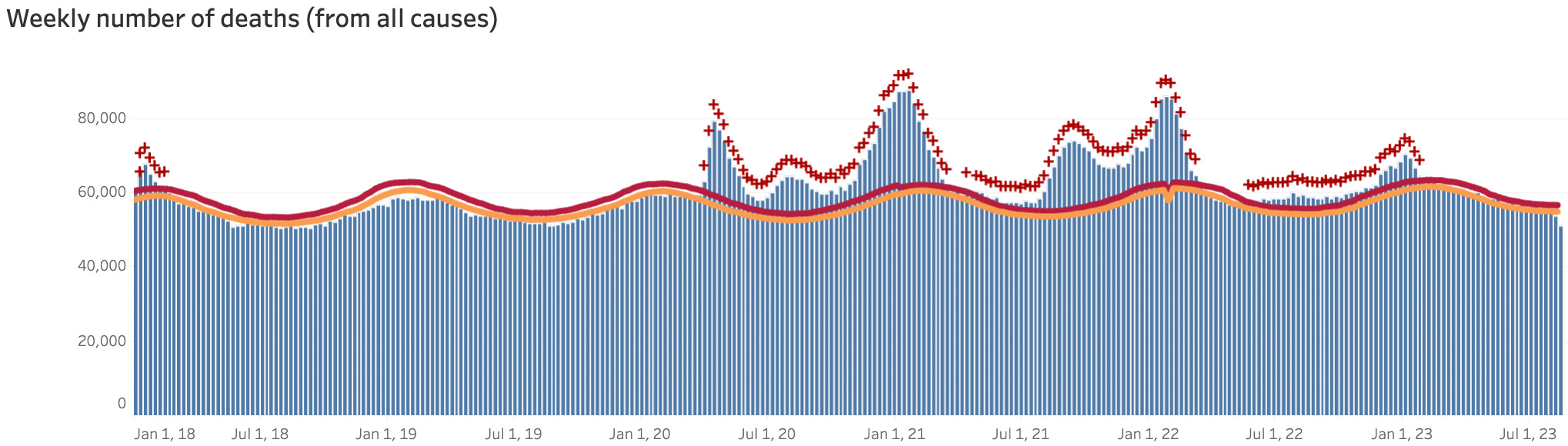 Since it is so easy for a death to be classified as one thing or another (e.g., I am relatively certain some of the deaths we classified as being due to COVID would have happened anyways and been labeled as flu deaths had COVID-19 never happened), it becomes necessary to a have a method of looking at this question which is free of that bias. The most reliable approach is to see if the total number of people who died increased, something which has occurred at a few key points during COVID, and also to lesser extents during the influenza pandemic. Consider for instance the USA’s data: