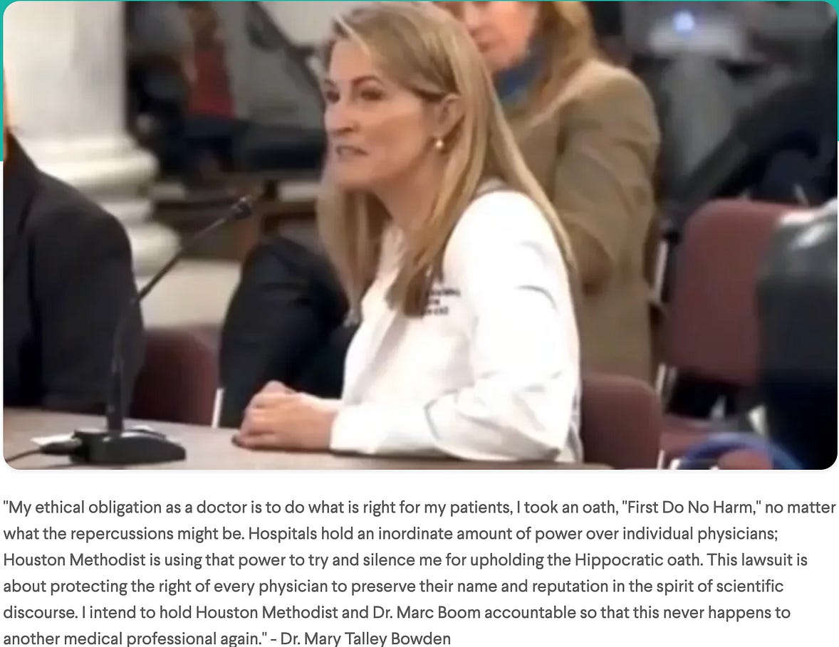 On November 12 2021, one of the largest non-profit hospitals in Houston with over $13 billion in assets suspended my privileges for spreading ‘dangerous misinformation.’ Days prior, I had released a series of 25 tweets all stating the same thing – “Vaccine mandates are wrong” – with a screenshot of different patient testimonials. Houston Methodist retaliated by declaring on Twitter I was spreading “dangerous misinformation” that was “harmful to the community.” I learned of my suspension through a text message from a reporter at the Houston Chronicle and spent the following months fielding interview requests from a swarm of media.