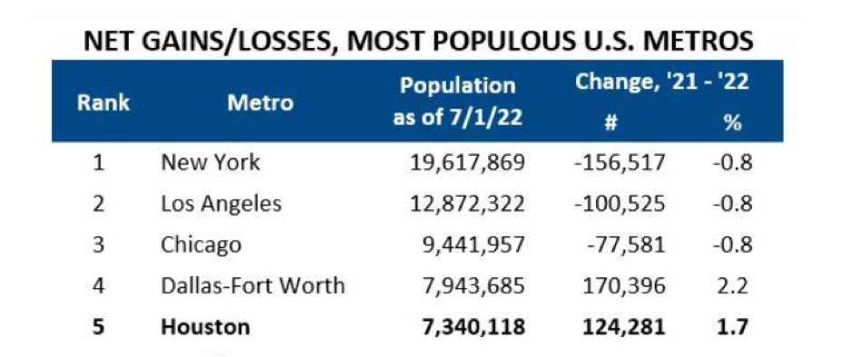 Over the last 10 years, Texas’ population has surged. Austin’s population has grown 33%, Dallas and Houston have each grown 20%. Recent figures show from 2021 to 2022, hundreds of thousands of people fled the blue cities of New York, Los Angeles and Chicago to settle in Houston and Dallas.