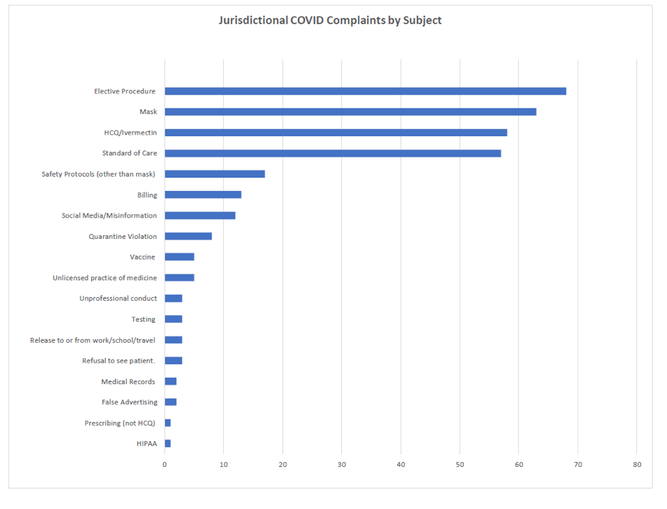 Senator Bob Hall helped me obtain statistics on COVID-related complaints to the Texas Medical Board. Since 2020, the TMB has received 1990 COVID-related complaints. 332 of those (16.7%) were ultimately deemed jurisdictional, resulting in an investigation. Here’s a breakdown of the nature of the complaints: