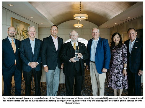 At that time, Governor Abbott was following the guidance of hospital ally Dr. John Hellerstedt, eventually awarded with the Texas Hospital Association’s THA Trustee Award – the highest honor given to someone not directly involved in hospital management. The THA commended him for “wearing a mask and becoming one of the first Texans to become vaccinated against COVID-19….During industry-wide calls to address the pandemic, Dr. Hellerstedt made sure the needs of hospitals were amplified as the state public health team worked to respond.”