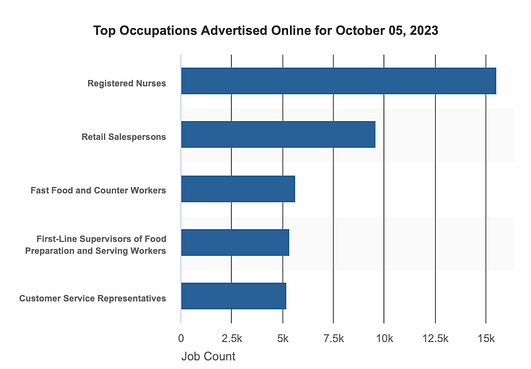 And where are these people working? In 2022, the top employment sector in Texas was healthcare. Presently, the top position advertised online in Texas is for Registered Nurses.