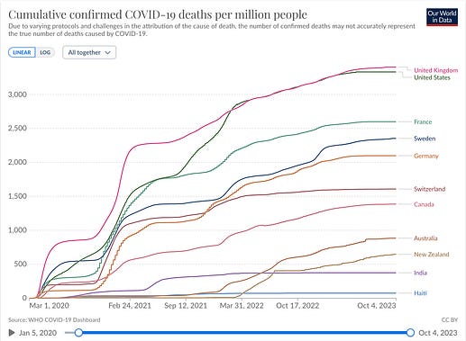 Lets begin with a look at the data. The report card, as it were. How did the renowned USA HHS and healthcare system, one of the most expensive in the world, do (relative to other countries) in handling COVID-19? Lets look at the “official” national death count data (as opposed to the insurance actuary all cause mortality data that Ed Dowd and others have been analyzing). And the answer is… The USA did not well at all relative to other western “five eyes alliance” nations – with the exception of the UK, which is right there with us. 3,330 cumulative “confirmed” COVID-19 deaths per million persons for USA since March 2020. 1.13 million US deaths.