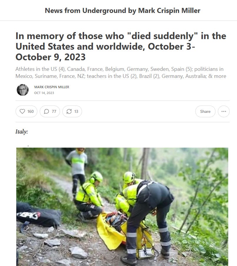 Mark Crispin Miller has been tracking “died suddenly” deaths since 2022. He estimates that he has documented over 10,000 such deaths since he started.