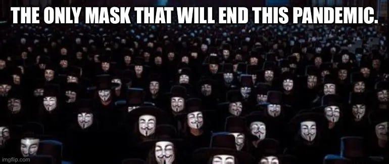 This is completely unacceptable, and my sincere hope is that the events of COVID-19 were such a strong shock to the citizenry that they will catalyze a return to liberty. To a degree, this appears to have happened as many topics that only a few years ago were completely unacceptable to discuss (e.g., antidepressants causing mass shootings) are now entering the popular discourse. In short, it appears that the anonymity the internet provides is effectively serving like the Guy Fawkes masks from V and providing a way for those who do not want to follow the societal insanity to safely do so and red-pill those around them.