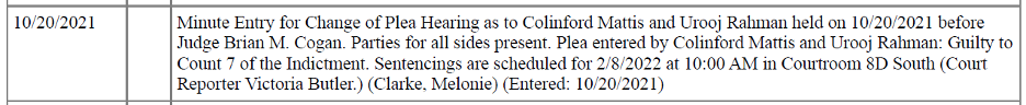 The docket reveals that the next 12 months unfolded as experienced attorneys would expect. The government provided plea offers to the defendants by February 22, 2021, and negotiations continued in the spring and summer. On September 23, 2021, the assistant U.S. attorneys notified the court that “the defendants…will accept the government’s plea offer” and requested that the court “schedule an in-person change of plea hearing at the earliest available opportunity.” On October 20, 2021, the defendants pleaded guilty. Most of this was routine, though the fact that the plea agreements were not filed publicly (then or now) is suspicious. Indeed, you would not have known to which offense the defendants had pleaded unless you were physically in court (unlikely, given widespread COVID concerns prevalent in October 2021) or were paying attention to the “minute entry” on the docket. Here’s what it says: