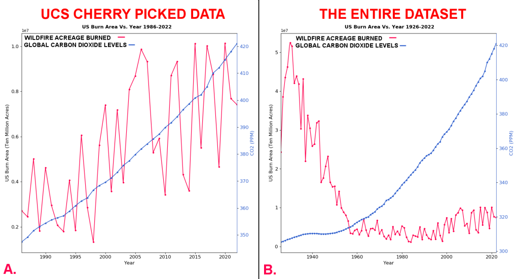 Panel A shows correlation between CO2 levels and wildfire when the UCS cherry-picked data is used, but in panel B, that correlation completely disappears when all of the wildfire and CO2 data is used. Sources: NIFC and NOAA Mauna Loa CO2 data. Graphs originally by Tony Heller, modified, combined, and annotated by A. Watts.