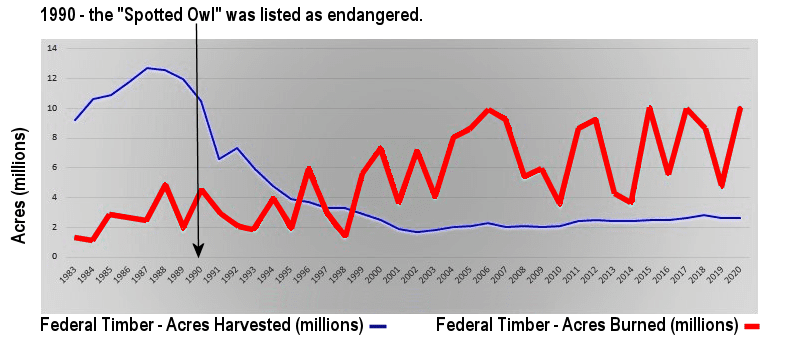 Figure 1: Graph combining data for Federal lands showing acres harvested vs. acres burned, in millions of acres. Data from U.S. Forest Service and the National Interagency Fire Center. Graph by Anthony Watts.
