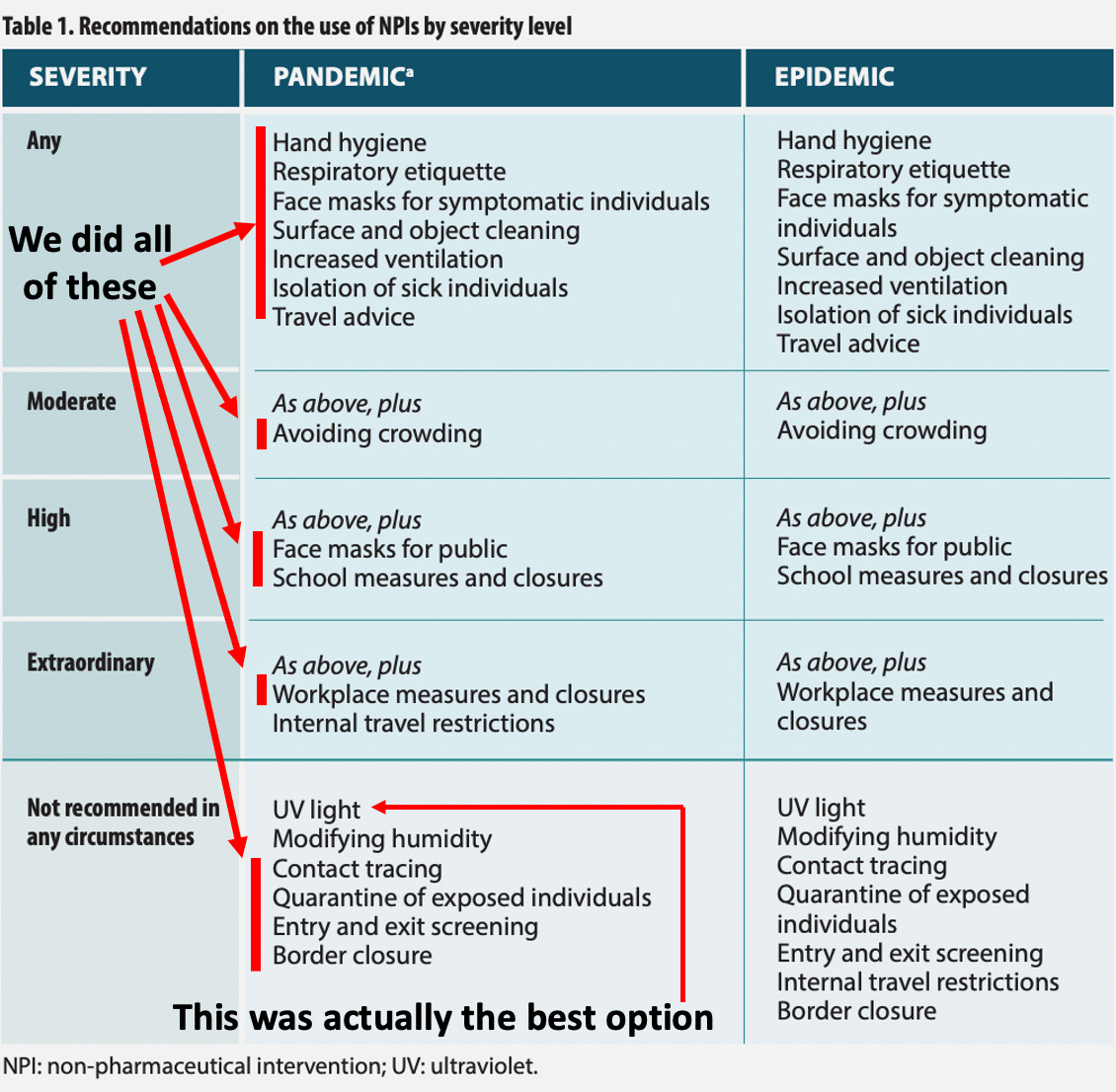 2. Once COVID was in a country, in the absolute best case scenario (assuming lockdowns worked 100% and everyone complied with them—neither of which was true), lockdowns could only pause the spread of the disease. However, since lockdowns could not be sustained indefinitely, they would eventually have to be broken, at which point all the people who had been “protected” from COVID would get it anyways. This approach hence only made sense if either: