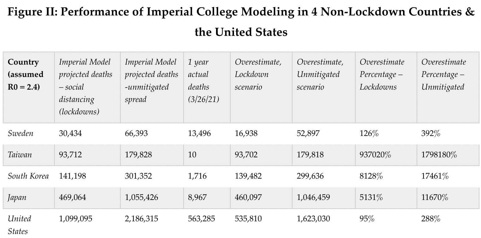 First, a model was put forward asserting that a global catastrophe would occur if strict lockdowns were not immediately implemented, and that model was largely responsible for convincing leaders around the world they had no choice but to enact the reprehensible lockdowns. To give you an idea of just how “accurate” it was: