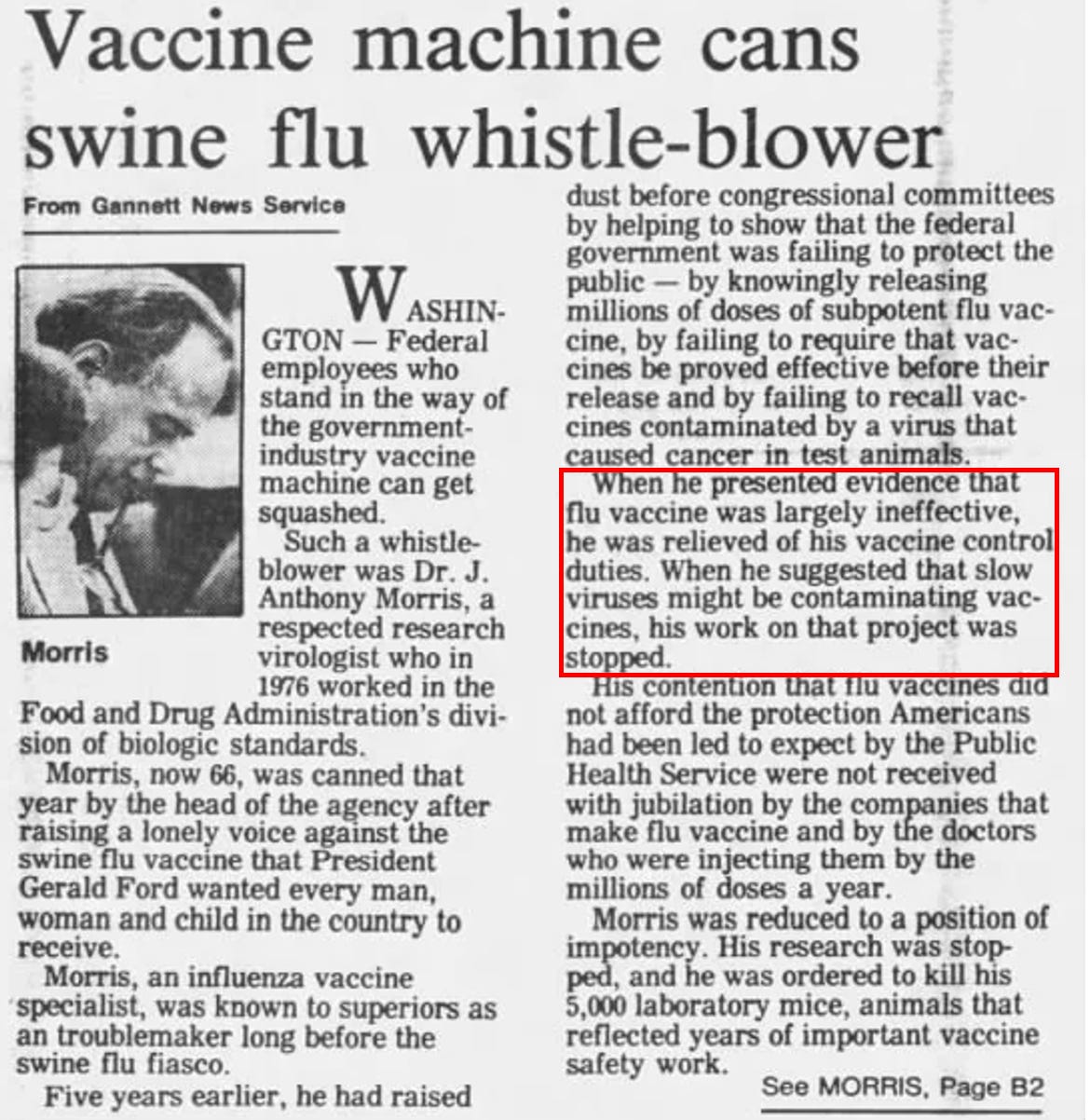 Note: I have been unable to find a transcript or copy of that 1976 show. However according to one account of it, Morris “warned the experimental vaccine could cause serious allergic and neurological reactions, had a very low potency, and was completely unnecessary as the virus concerned was an ordinary pig virus, and not highly pathogenic, and had died out within two weeks of it’s being detected in February, and had not been seen anywhere else.”