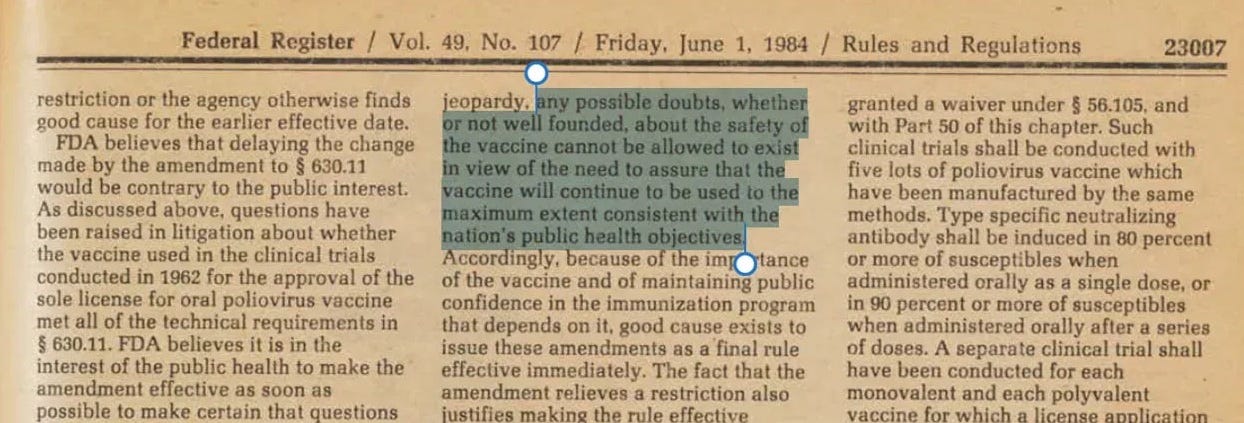 One of the most important takeaways from the polio fiasco was an admission the FDA made into the federal registrar that any doubts regarding the safety of a vaccine, regardless of their validity, could not be allowed to exist as that would make less people get the vaccine: