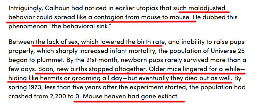 Dr. Calhoun asked: what happens if, instead of endangered living, mice are placed in an equivalent of a modern 15-minute city, with unlimited food, mouse housing, and absence of disease and predation?