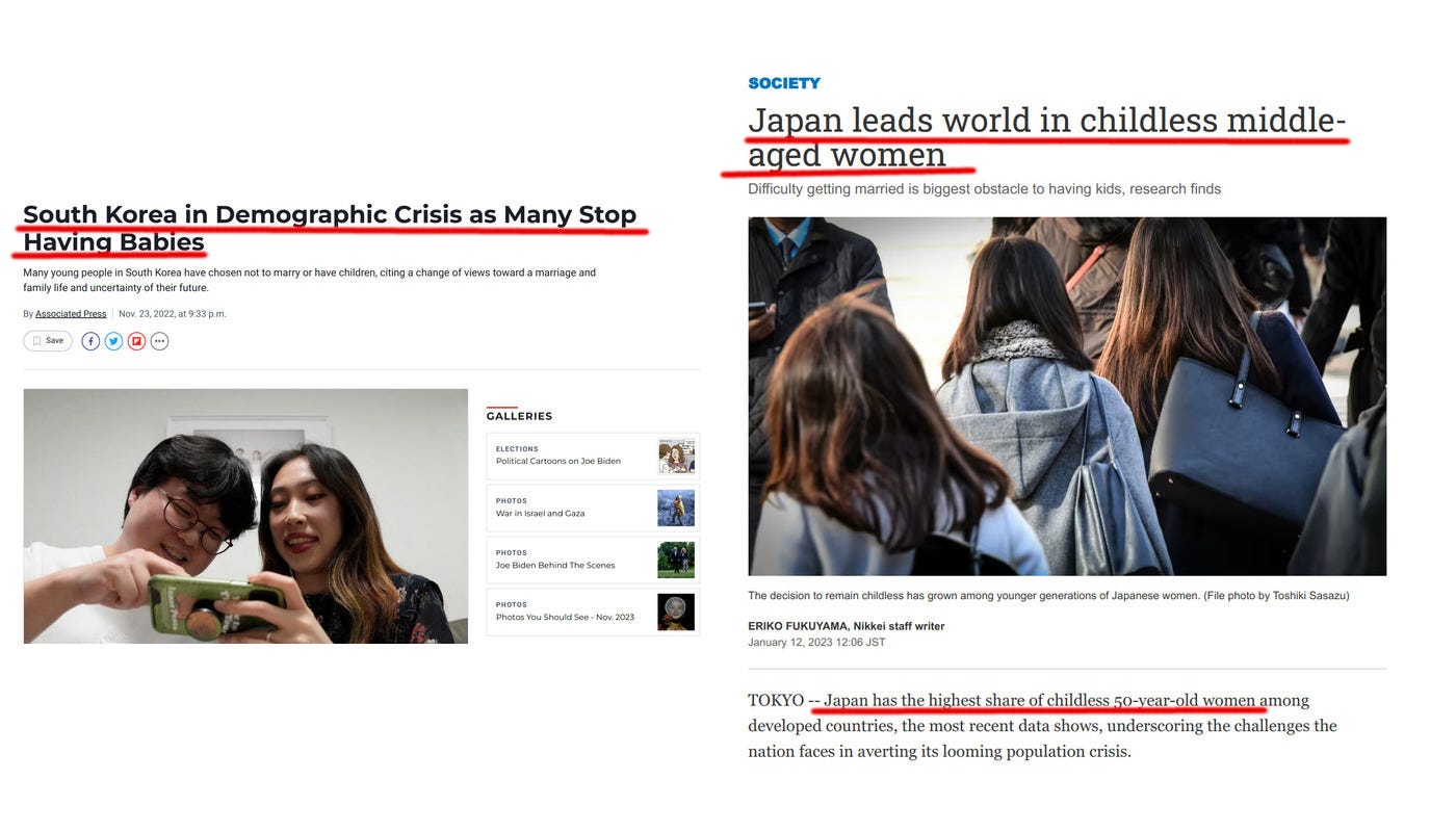 In many countries, numerous women and men already choose not to have progeny, and birth rates have fallen way below replacement levels. Japan and South Korea are “leading” the way: