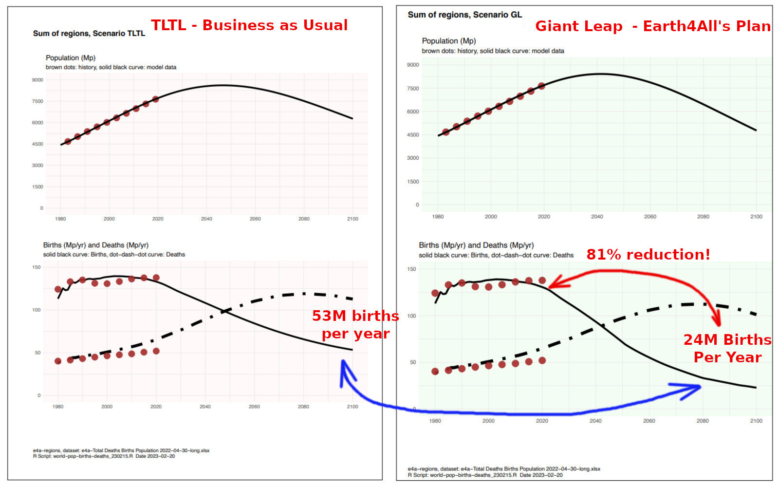 The Giant Leap plan (right bottom corner) reduces childbirths from the current 130 million per year to about 24 million per year globally by the year 2100.