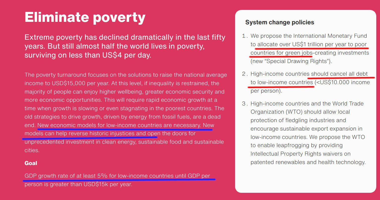 Impoverished people and smallholder farmers tend to have children to help with the family farms or as a social safety net for older age. So, the plan proposes to eliminate poverty by initiating massive economic transfers from wealthy countries to impoverished countries: